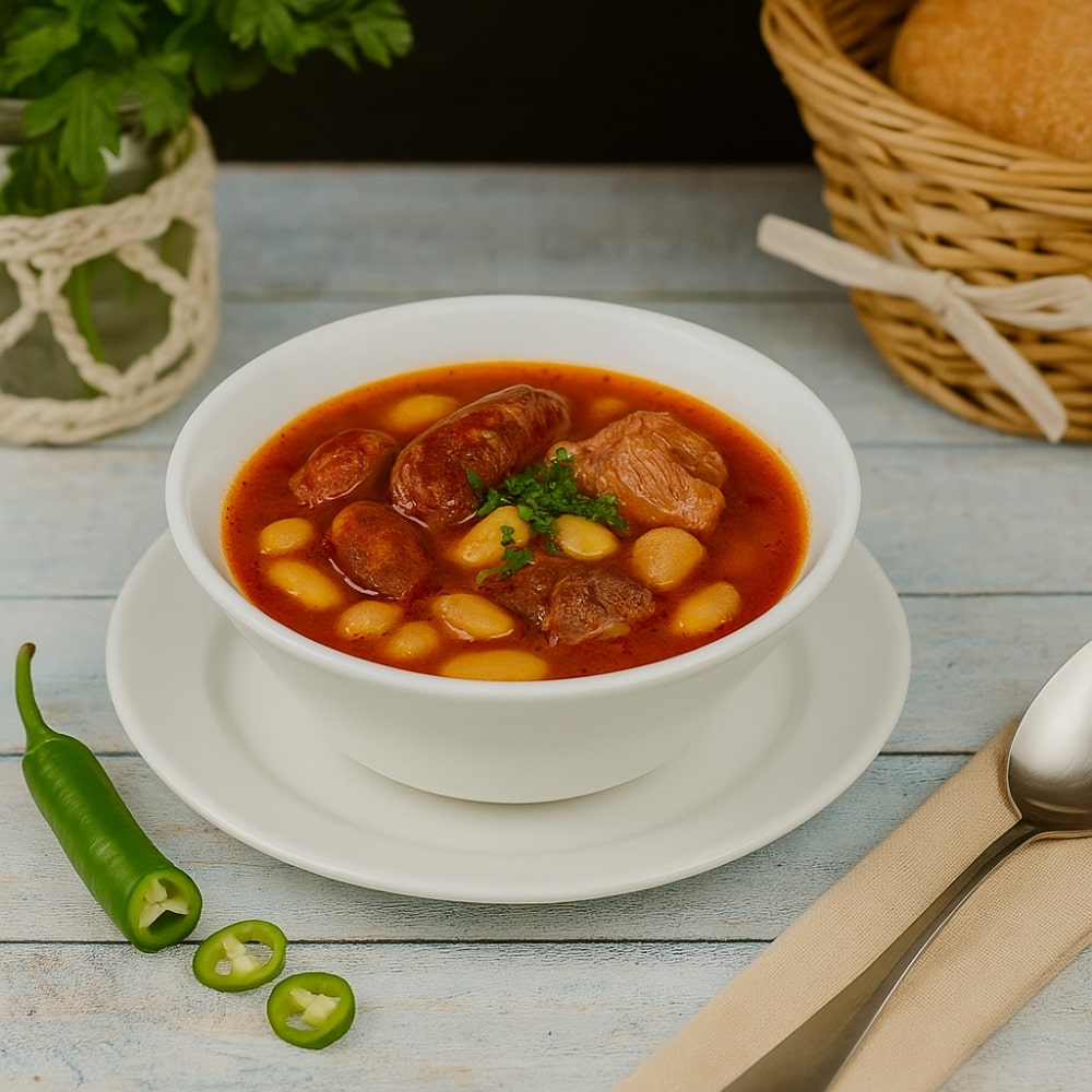 Gazdag, füstös ízvilágú babgulyás füstölt csülökkel és házias kolbásszal – tartalmas, laktató fogás, ami minden kanállal a vidéki konyha ízeit idézi.