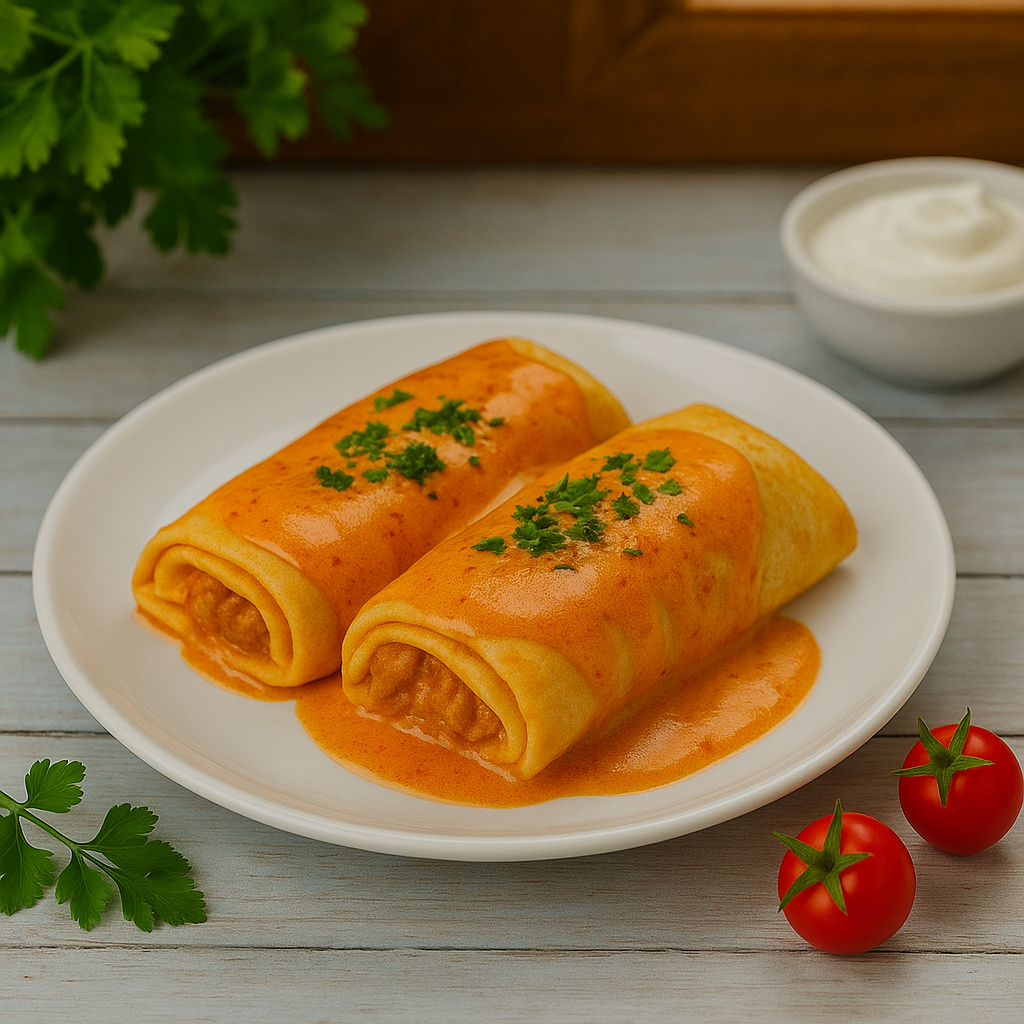 Hortobágyi húsos palacsintánkat hagyományos módon, gazdag, szaftos pörkölttel töltve készítjük, amelyet ízletes paprikás-tejfölös mártással öntünk le. A palacsinta omlós tésztája tökéletesen magába zárja a fűszeres, zamatos húst, így minden falat igazi magyaros élményt nyújt. Ez a klasszikus fogás laktató és ízletes választás a hagyományos magyar konyha kedvelőinek.